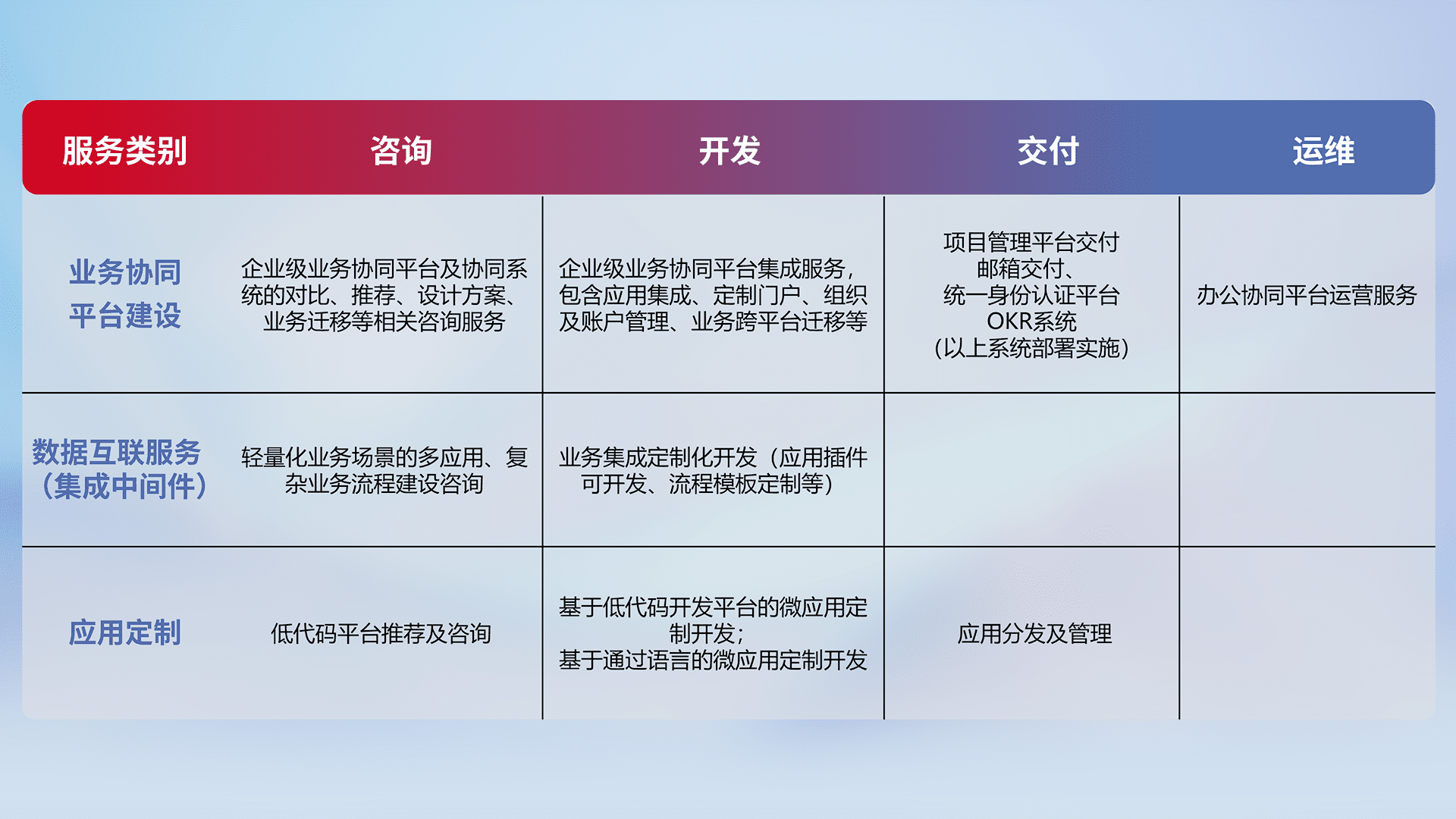 针对钉钉、、企微、、、、IDaas等平台级产品提供产品的规划、、方案、、、、交付、、、、定制化开发等服务,,,实现如统一协同办公、、、、智能客户服务、、、混合会议管理、、、、智能数据查询、、、等业务场景,,,,实现数字化转型。。